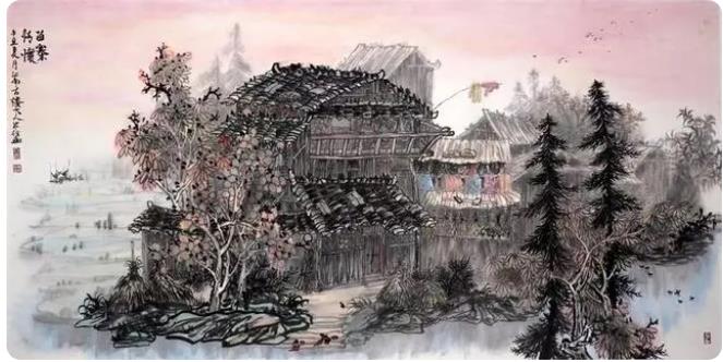 因此,唐年桂主用积墨,结合多年的写生,创造出富丽优雅的古寨奇观,被评论家称为“古寨山水”。