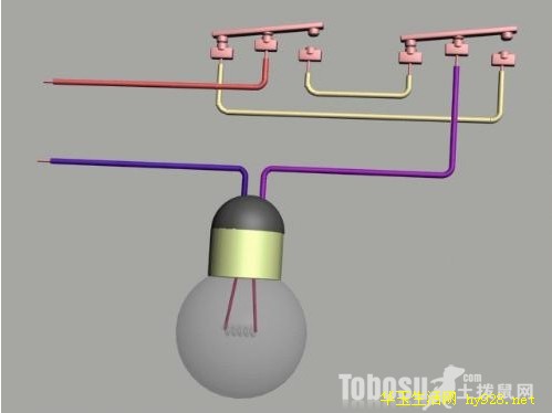 2、双联线中的另一条导线连接两个开关的上接线端(或者下接线端),并且在中间接一条分支线与灯的一端连接,灯的另一端接零线。
