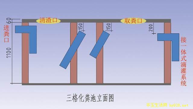 二池和三池之间也用过粪管连接,过粪管采用长度为50-55cm,内径为15cm的PVC管,过粪管与隔墙的夹角以60度为宜。