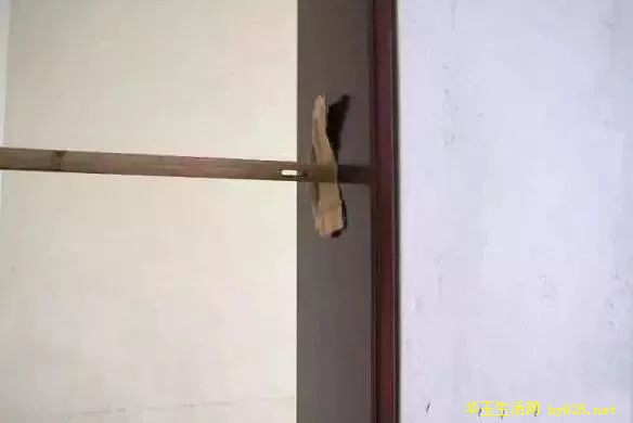放入门洞也同样要经过校正方可固定并使用,先根据门的宽度截三根木条,比如门宽80公分,木条的宽度应该是80.8公分,取门套的上、中、下三点,将木条撑起,请注意木条的两端应垫上柔软的纸,防止校正的过程中划伤门套表面: