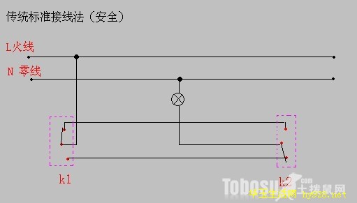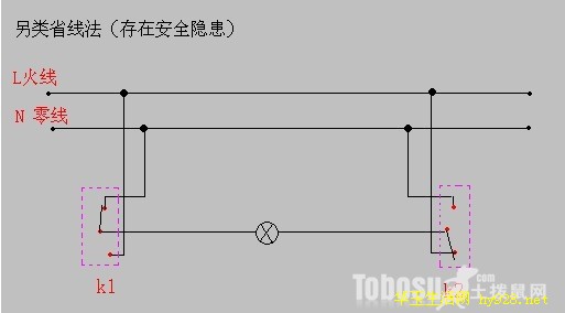 特别提醒,采用省线法,虽然节省些导线,但安全隐患非常大,特别是使用的开关质量不好时,常由于切换接线端时,由于开关分离不彻底,比较容易导致开关内部短路,从而导致整个线路短路,烧毁电表保险丝,如果使用了一段时间之后,这种表现尤为突出。因此不提倡使用这种省线法布线。