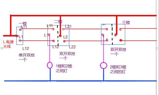 2、两个开关都入火线,而且只能接于上接线端(或者下接线端),这就使得灯亮时,两个开关的三个接线端对零线的测量电压都是220v,即试电笔都显示为红色。