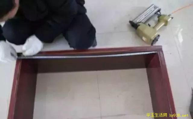 17.将门挡条上的扣线涂上胶水,干后扣入门挡条上面的槽中,请注意这是整个安装过程中唯一使用胶水的地方,优良的环保性能体现无疑,完美遮盖钉眼,门、门套、门挡条浑然天成,三合为一,环保与美观并存: