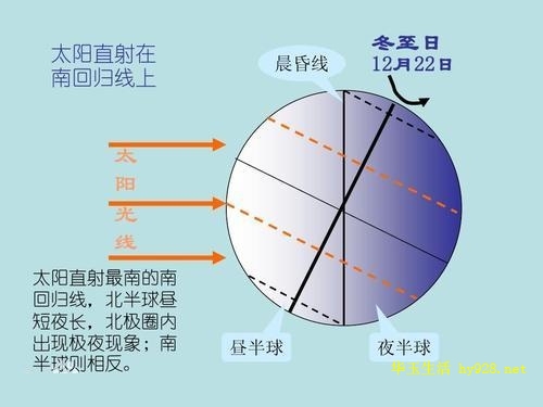 冬至,作为中国二十四节气的一个重要节点,这是地球赤道以北地区白昼最短、黑夜最长的一天。冬至是太阳南行的极致,这天北半球的太阳高度最小。冬至这天太阳光直射南回归线,太阳光对北半球最为倾斜。冬至是太阳南行的转折点,这天过后它将走“回头路”,太阳直射点开始从南回归线(23°26′S)向北移动,北半球(我国位于北半球)白昼将会逐日增长。由于冬至前后,地球位于近日点附近,运行的速度稍快,这造成了在一年中太阳直射南半球的时间,比直射北半球的时间约短8天,因此北半球的冬季比夏季要略微短一些。