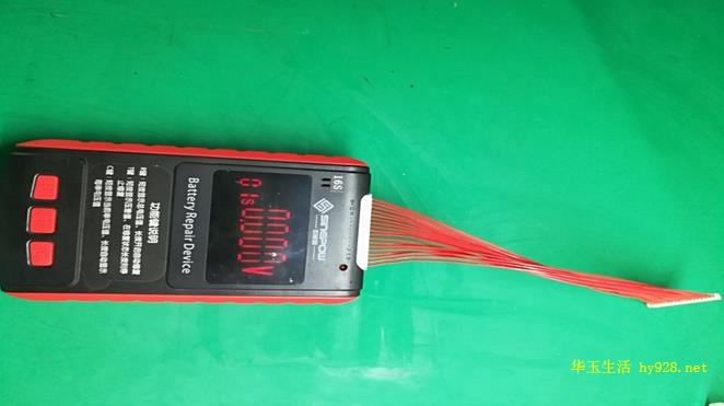 目前专用的修复仪(图6-5)品牌还比较少,其工作原理主要是通过连接电池排线检测每一串的电压,和总电压,可显示压差和检测排线顺序是否正确,通过整组放电至某串电芯达到最低工作电压,再通过每串单独放电致最低工作电压以达到修复压差的目的。修复仪在组装时也可以用作快速检测排线顺序和测量各串压差的工具。