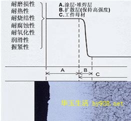 多功能冷焊机原理是利用充电电容,以10-3~10–1秒的周期,10-6~10–5秒的超短时间放电。电极材料与工件接触部位瞬间会被加热到8000°C~10000°C,等离子化状态的熔融金属以冶金的方式过渡到工件的表层。左图1所示的是堆焊、涂层的示意图及各种特性。A区是堆焊到工件表面的涂层或堆焊层,由于与母材之间产生了合金化作用,向工件内部扩散,熔渗,形成了扩散层B,得到了高强度的结合 [1] 。