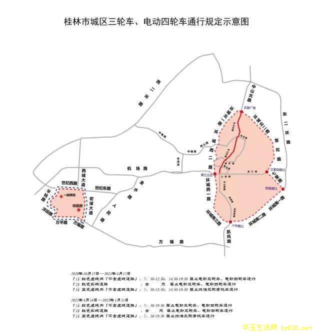 (1)普陀路-环城北二路-北极广场路口-环城北一路-环城西二路-香江立交桥-环城西一路-环城南三路-八中路口-环城南二路-环城南一路-桂磨路口-七星路-三里店路口一线(不含)以内区域道路, 7:30-12:30、14:30-19:30禁止电动三轮车、电动四轮车通行。