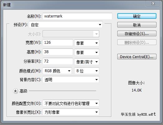 1、打开ps软件后点击新建图片,由于这个程序水印logo名称为“watermark”格式宽度为126 像素,高度为38像素