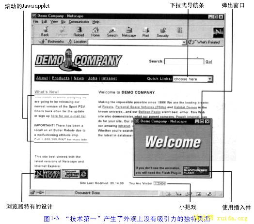 当然,另一种极端的情况则是一开始就专注于实现技术,那些站点尽管采用的都是最新和最好的技术,但通常缺乏一种整体的设计。外观上看起来非常笨拙,界面也非常令人困惑。有时候这些站点又采取一种称为“圣诞树”的设计方式。一旦实现了基本功能,开发者就开始像用彩球或剪纸装饰圣诞树一样,竭尽所能用G I F图片去修饰页面,最终却徒劳无功。这种情况下,外观相对技术来说处于次要的地位。同样,在”外观第一”的情况下,技术被用来显示开发者的技艺而不是满足使用者的需要。过多地采用Java applet和插件,并要求浏览器支持最新版本的D H T M L、 X M L或C S S,这正是“技术第一”的标志。追求“技术第一”的站点企图采用独一无二的设计,使用最新版本的浏览器,常常缺乏对站点功能的支持。一个过分推崇技术的站点的例子见图1 - 3。