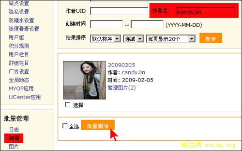 拿时下最流行的SNS建站程序UCenter Home来说,如果站长发现一个向相册中传违法图片的用户,可以通过UCenter Home后台找到用户所传的相册进行删除并给与警告和监控。具体方法:UCenter Home后台-相册-通过用户名搜索用户-批量删除。