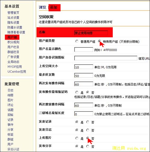如果该用户还继续上传违法图片,则可以对其进行“特殊用户组”的设置,禁止用户上传图片至相册和日志。具体方法:UCenter Home后台-用户组-添加-建立一个限制用户上传图片组,然后把用户设置为该组会员。