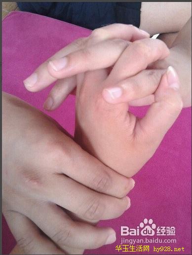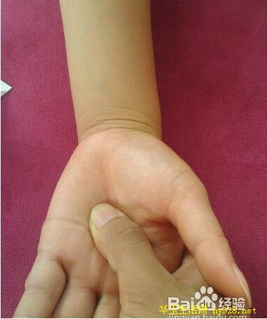 2、手掌劳宫穴,拇指按住劳宫穴推拿,劳宫穴;中指弯曲所对应的掌心位置即是。