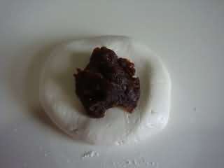 将和好的面团分成等量的剂子,取一个按扁后包入豆沙,搓成圆球。