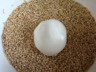 搓好的麻团放在芝麻碗里,多滚几圈。