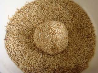 使其均匀粘上芝麻,最后再用手团紧按压下,防止芝麻掉下。