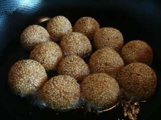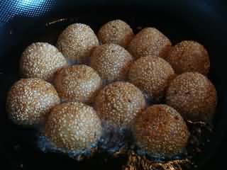炸的过程中要不停用铲子翻动麻团,使其均匀受热,等麻团体积变大浮起来,呈金黄色时捞出。