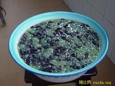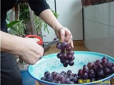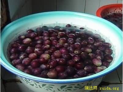 2、把剪好的葡萄冲洗干净后用淡盐水浸泡十分钟左右,这是为了去掉葡萄皮上的农药和其他有害物质,(前面说到葡萄伤了皮的不要用来酿制葡萄酒,就是害怕浸泡时盐水浸到果肉里面去了,影响葡萄酒的质量);