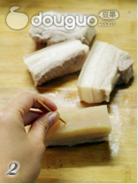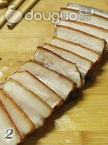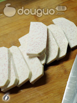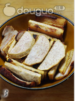 11.油炸芋头同时 五花肉同样切成8mm左右的厚片。