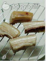 4. 如果没有蜂蜜调色可以在五花肉抹上加水的老抽和醋后放到晾架上把表面晾干,能一定程度的减少炸时的热油飞溅。