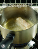 6. 油炸五花肉,炸至皮能敲响即可,此时一定要小心,肉皮接触到油一定会有很劲爆的飞溅,注意安全哈~,