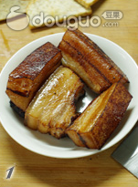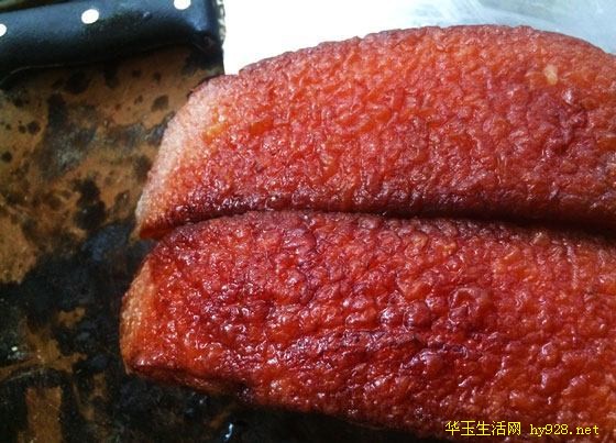 3. 按照麦芽糖:水=1:1的比例,在五花肉上均匀的的刷一层糖水。没有麦芽糖可以用蜂蜜代替(蜂糖经过油炸后皮也变深色)。