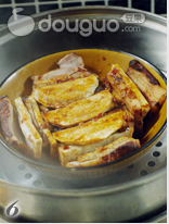 9. 芋头片先入油锅炸制边缘金黄,表面微黄。