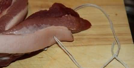 2、在肉上扎一个孔,穿上棉线,方便以后挂起。