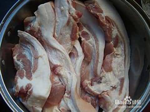 3、先把肉平铺桶内,然后撒上盐和高度三花酒,按1000克肉内加入约50克盐(即比自己正常吃要咸一点),50毫升高度三花酒(记得一定要45度以上米香型酒)底下一层放盐就少一点,上面一层多一点。视肉厚度决定腌制3-5天左右。