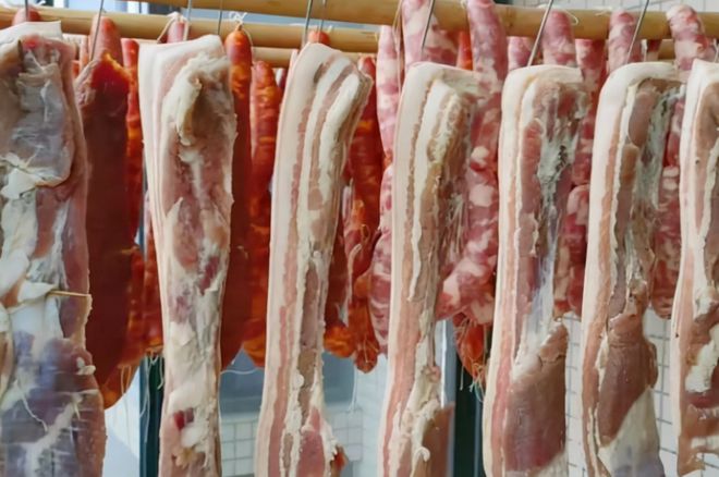 1、此方法属桂林特色腊肉的腌制法,用无烟炭火烘的腊肉透明、香,不柴。