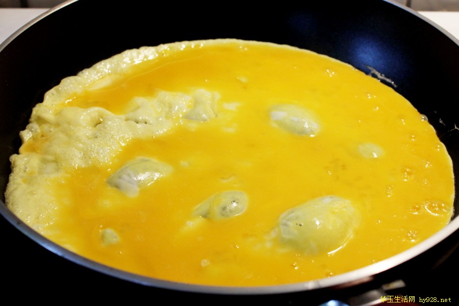 3.锅里油烧热,倒入蛋液,蛋液入锅立刻蓬起,这油温就是最佳。