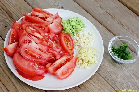 1.西红柿切块,姜切末、蒜拍一下切碎、葱切花。