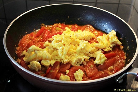 8.一直炒到西红柿出汁变软时,将前面炒好的鸡蛋倒回锅中,翻炒匀出锅。