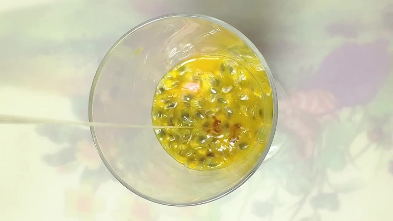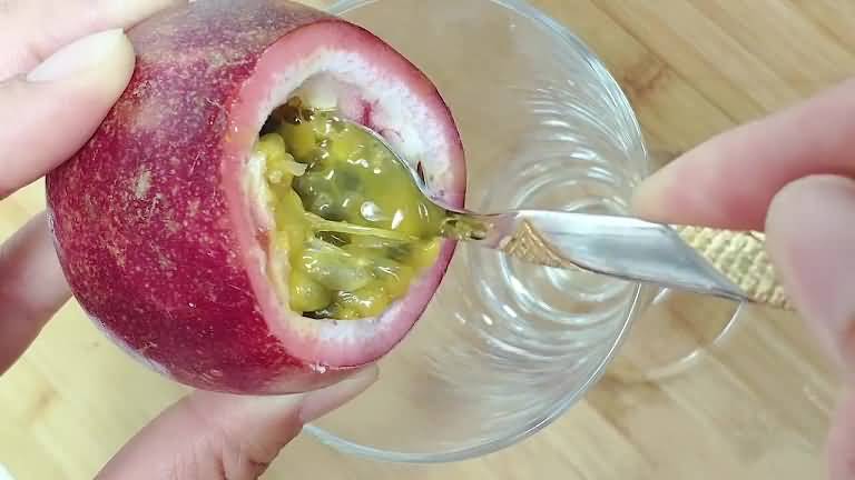 提前准备3个百香果,先将它的顶部切开,然后用调羹把里头的果肉取出来,并且倒入杯中。