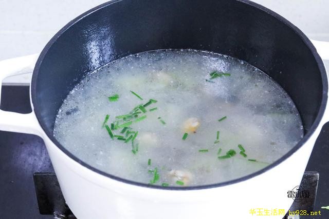 5、倒入汤锅中,加入半锅的水,煮开之后,倒入蛤蜊再次煮开。 撒入食盐调味,再滴两滴香油,撒入葱花点缀。 又香又开胃的冬瓜蛤蜊汤就做好啦。