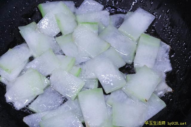 4、 起锅放少量的食用油,倒入冬瓜翻炒至都裹上食用油。