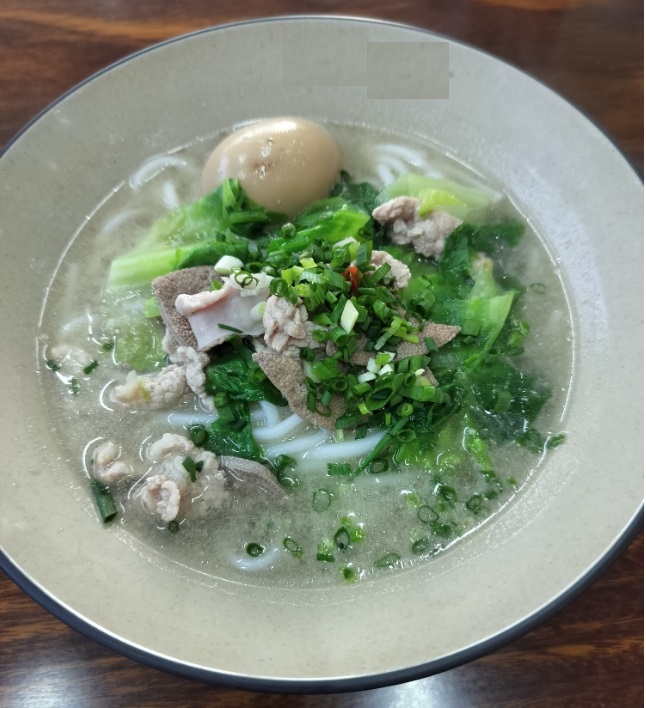 圆柱形的粉利,粗细类似于婴孩的手臂。炖煮时,将其侧切成方形或者椭圆形的粉片,而后牛肉叉烧等食材一同炖煮,起锅前放入一把青葱的西洋菜,清雅的稻米香与香浓的肉味交织合抱,融出一种别样的鲜香。