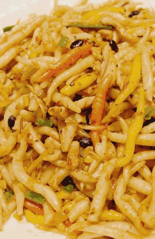 由簸箕搓捻而成的粉虫,白嫩韧滑,淋上麻油、苏梅酱,再浇上一勺辣椒酱,均匀搅拌开的粉虫像是被化了个浓墨重彩的欧美妆。被辣椒酱包裹的粉虫,细看还留有簸箕的纹路,而褐色的酱汁,则泛着盈润的亮光,沿着粉虫上的纹路缓缓滑行。