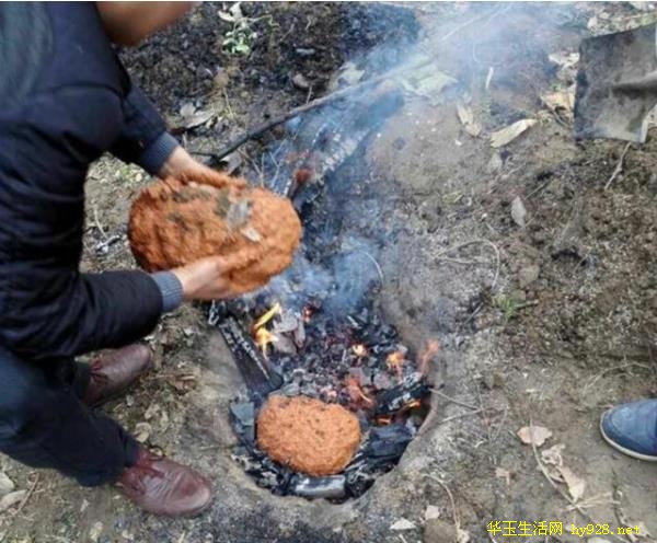 7、在上面生一堆篝火,不要太大了免得受热不均匀,等火自然熄灭自然冷却了,把鸡球挖出来,用石头一敲 鸡球表面的泥块就碎了,一拔就下来,连毛都带下来,一根不剩,即可食用。