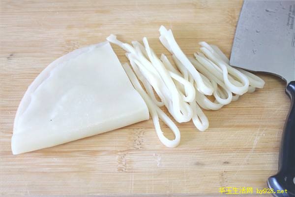 10.将凉皮切成宽条,放入适量的黄瓜丝,蒜水,米醋,辣椒油。