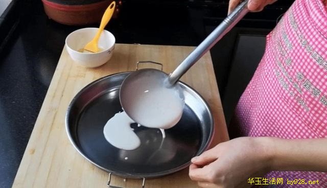 4.凉皮锣锣内刷上薄薄的一层油,舀上一勺面糊。
