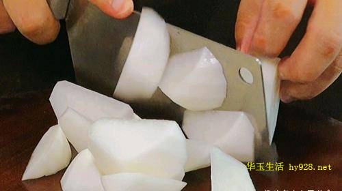 白萝卜切成小块备用。鱼头买时就叫老板对半切开,不用剁小块了。