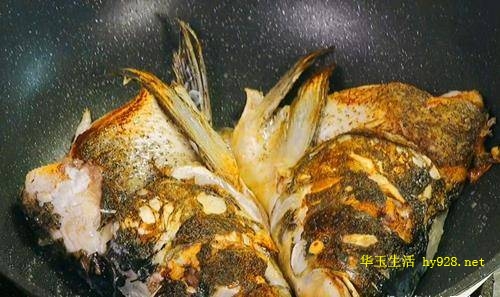 在煮羊排的时候就可以起锅煎鱼头了,先煎鱼皮一面,煎至金黄色再煎另一面,这样会使汤更奶白色。煎好再撒点白酒,让酒精挥发一下就倒入大半锅清水。