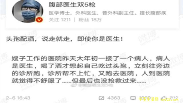 昨天下午有有名叫腹部医生双5枪的博主转发了一条动态:嫂子工作的医院昨天大年初一接了一个病人,病人是医生,喝了酒才想起自己吃过头孢,立即往旁边诊所跑,诊所帮不上忙,又跑去医院,人到医院就觉得不舒服了,但最后也没抢救过来。